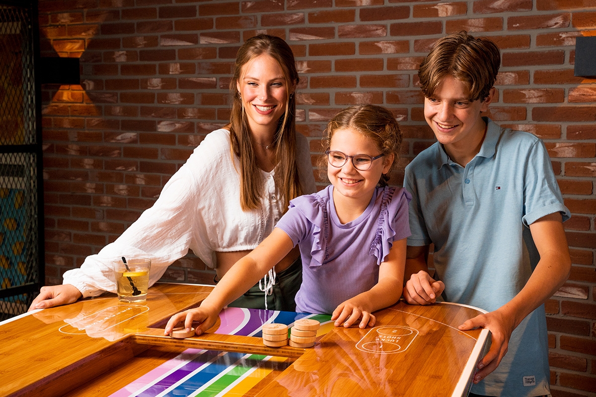 Ouderwets gezellig sjoelen en shuffleboard, in een nieuw, modern en uitdagend jasje. Speel met of tegen elkaar en ontdek dat strijd gezelligheid perfect hand in hand gaan!