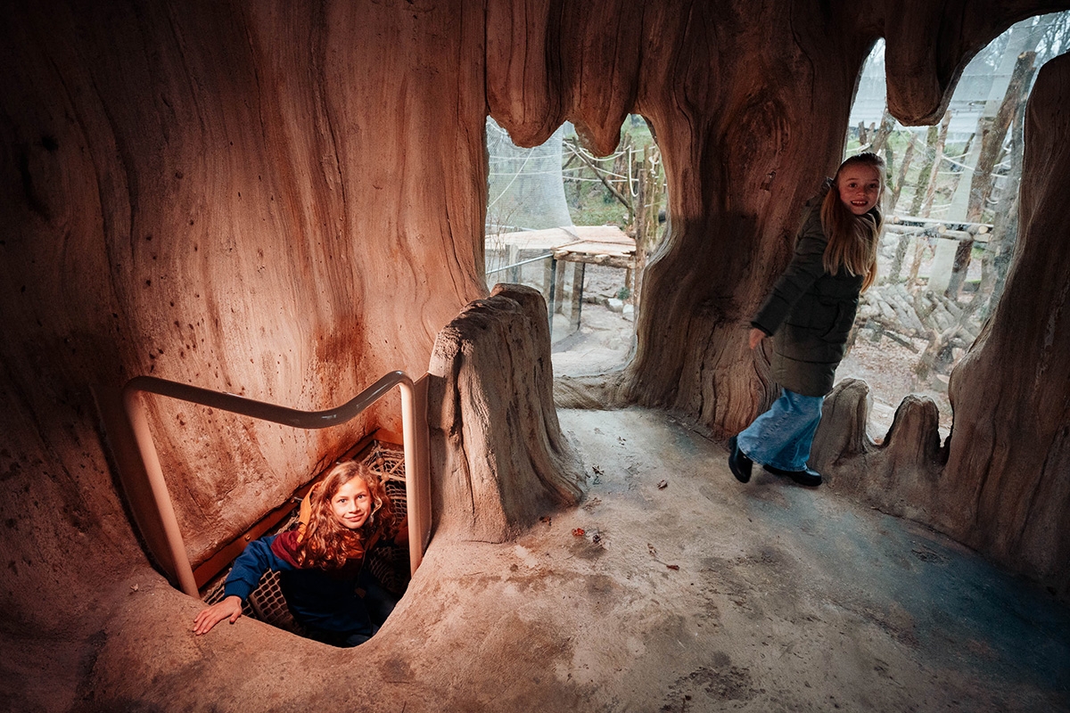 In DierenPark Amersfoort, uitgeroepen tot leukste dierentuin van Nederland, klim en klauter je onder, boven en tussen de dieren! Glijd langs de hyena’s en vaar tussen de ringstaartmaki’s.