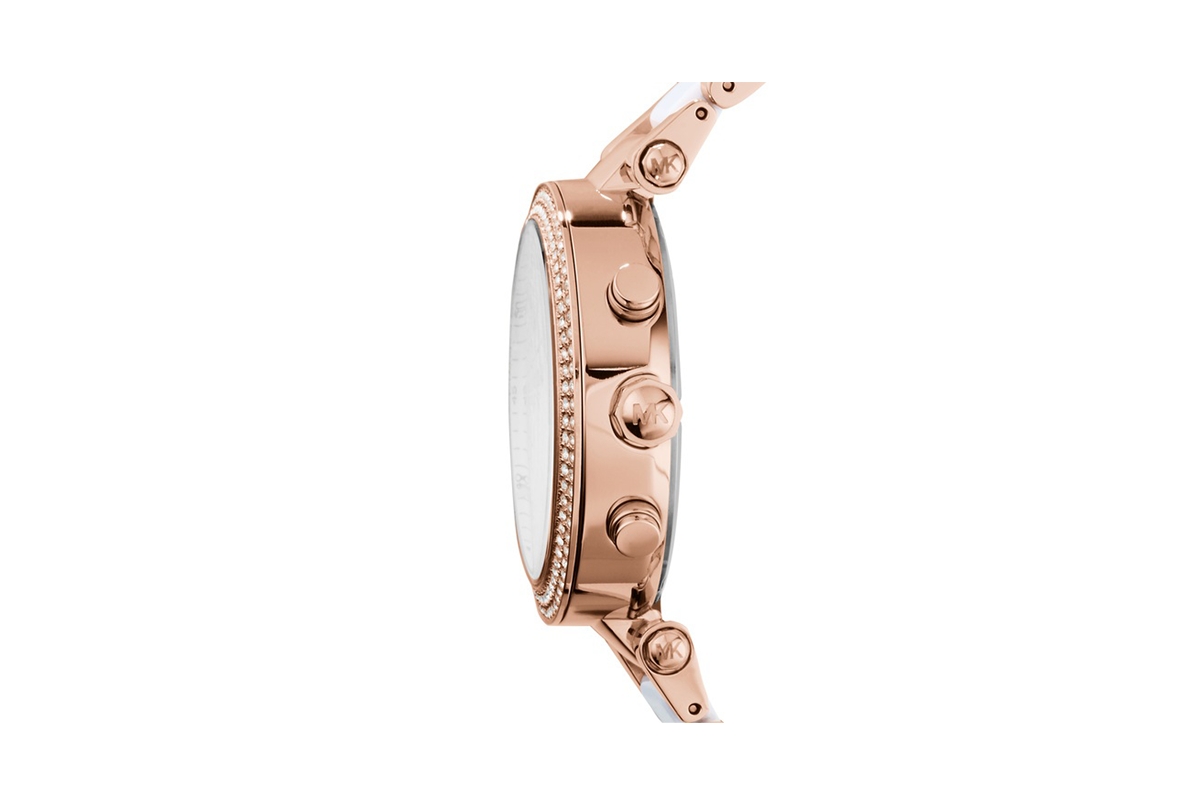 Michael Kors dameshorloge. Het roségoudkleurige roestvrijstaal staat in contrast met de opaalachtige wijzerplaat en de glitterende steentjes ingelegd in de topring.